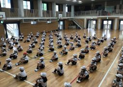 各クラス4列で整列し、両手間隔で広がる練習をしました。「しゃべらず10秒で広がる」を目標に練習を続け、6回目にやっとできました。