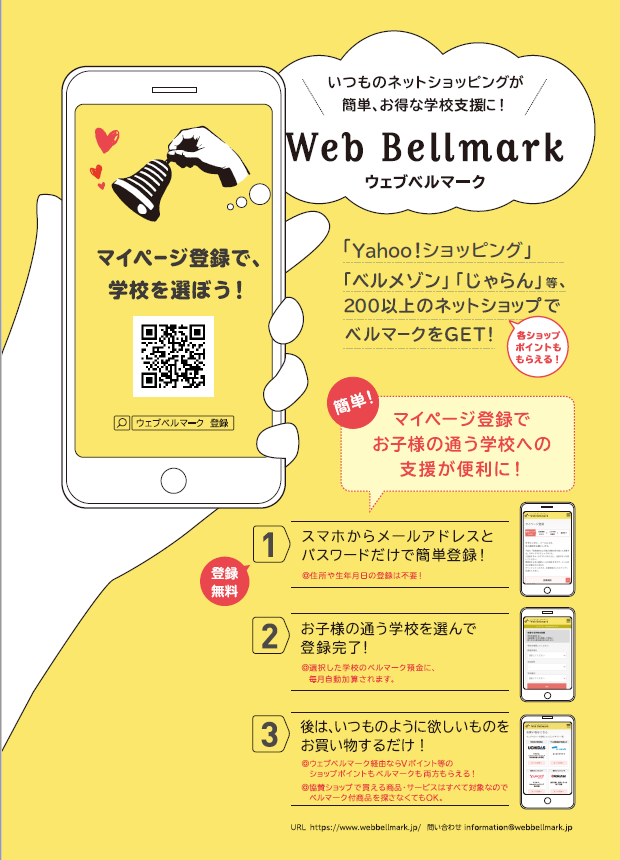 いつものネットショッピングでベルマークがもらえる、『ウェブベルマーク』活動を本校でも積極的に行いたいと思っております。