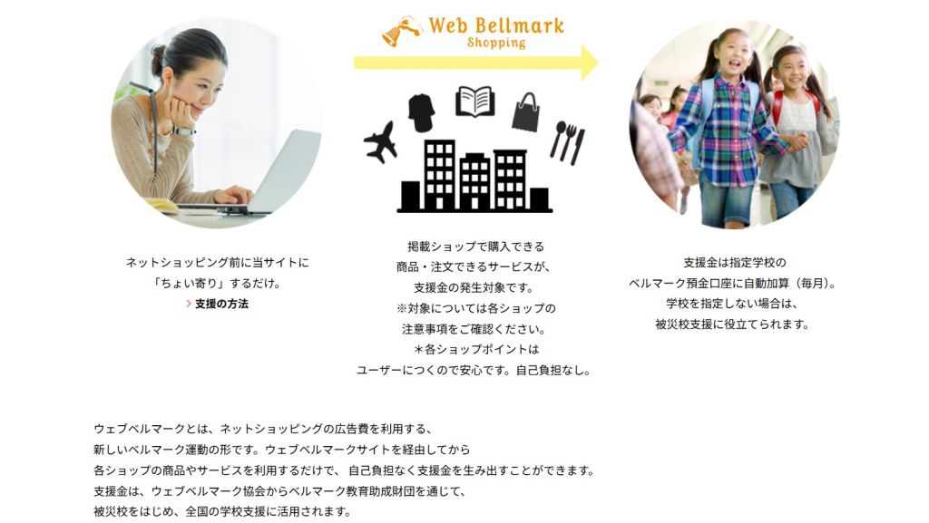 ウェブベルマークサイトからお好きなショップにアクセスし、商品を購入することで、学校を支援することができます。