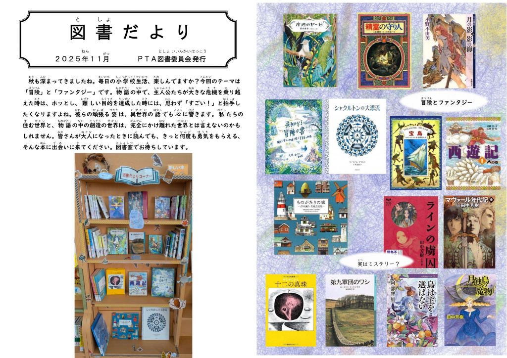 図書だより 11月号「冒険とファンタジー」🏰✨ 2025.11.17 図書委員会 図書だより11月号が発行されました。 今号では、「冒険とファンタジー」を特集しています🪄 読書の季節、ドキドキワクワクの冒険と空想の物語に旅してみませんか?⛵️🐉✨ 是非図書室に足を運んでみてくださいね。 « 前へ一覧へ 関連するPTA活動 📚新刊本が入りました📚 2025.11.08 図書委員会 🦉第4回 読み語りの会『ドラゴンのバラ』 2025.11.04 図書委員会 📕第2回 1年生出張読み語り📕 2025.10.28 図書委員会 📕第1回 2年生出張読み語り📕 2025.09.25 図書委員会 PTA活動 広報委員会 健康安全委員会 レクリエーション委員会 図書委員会 文化委員会 ソフトボール バレーボール コンピュータ コーラス お知らせ PTA広報だより