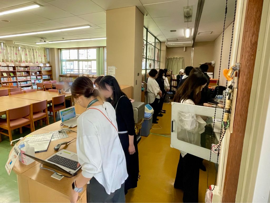 体験会初日には4年生の授業もあり、実際に貸出、返却の手続きなどをご体験いただきました。
