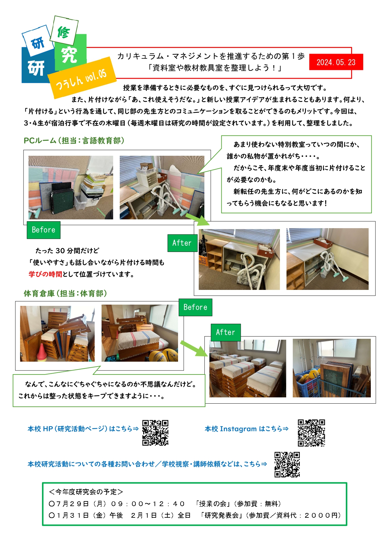 令和6(2024)年度 研究通信vol.05 2024.05.23 研究部 « 前へ一覧へ 次へ » 関連する研究活動 R7(2025)年度授業づくりの会(冬季研究会)公開授業のご案内 2026年2月6日(金)7日(土)開催予定 2025.10.17 研究部 R7「授業づくりの会」(研究会)のお知らせ 申込は10月30日(木)正午~ *先着申込順となります。 2025.10.10 研究部 AIとの対話を通してアイデアを 2025.08.26 研究部 2025.研究通信05 授業の会(夏季研修会)ありがとうございました。 2025.07.31 研究部 研究活動 国語科 社会科 算数科 理科 生活科 総合的な学習 音楽科 図画工作科 家庭科 体育科 特別な教科 道徳 外国語 研究部 お知らせ STEAM