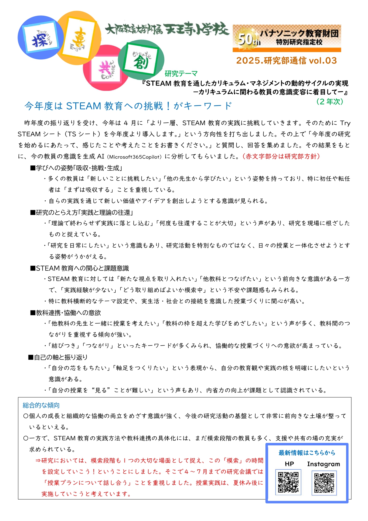 2025.研究通信03 2025.05.13 研究部 « 前へ一覧へ 次へ » 関連する研究活動 R7(2025)年度授業づくりの会(冬季研究会)公開授業のご案内 2026年2月6日(金)7日(土)開催予定 2025.10.17 研究部 R7「授業づくりの会」(研究会)のお知らせ 申込は10月30日(木)正午~ *先着申込順となります。 2025.10.10 研究部 AIとの対話を通してアイデアを 2025.08.26 研究部 2025.研究通信05 授業の会(夏季研修会)ありがとうございました。 2025.07.31 研究部 研究活動 国語科 社会科 算数科 理科 生活科 総合的な学習 音楽科 図画工作科 家庭科 体育科 特別な教科 道徳 外国語 研究部 お知らせ STEAM