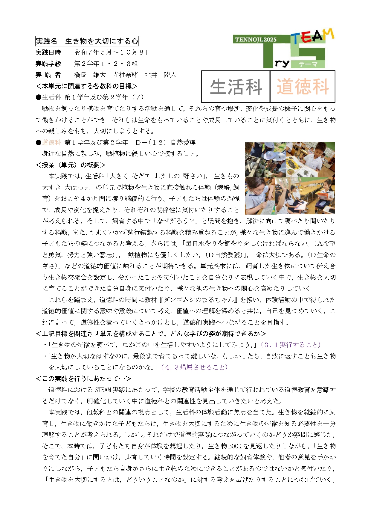 2025.10.08.Try STEAM.2年道徳「ダンゴムシのまるちゃん」 2025.10.08 特別な教科 道徳 « 前へ一覧へ 次へ » 関連する研究活動 2025.10.08.Try STEAM.2年道徳「ダンゴムシのまるちゃん」 生き物を大切にする心を育てるために 2025.10.08 特別な教科 道徳 2024.11.07.6年道徳「最後のおくり物」 キーワード:道徳的価値/新しい価値への気づき 2024.11.07 特別な教科 道徳 2023年9月7日(木)1年 教材名「はしのうえのおおかみ」 2023.09.07 特別な教科 道徳 2021年09月 3年テーマアプローチ授業実践 テーマアプローチコンセプトシート(音楽科・道徳科・外国語活動) 2021.09.21 特別な教科 道徳 研究活動 国語科 社会科 算数科 理科 生活科 総合的な学習 音楽科 図画工作科 家庭科 体育科 特別な教科 道徳 外国語 研究部 お知らせ STEAM