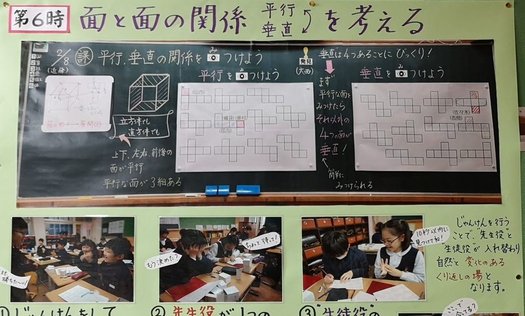 研究発表会当日は、「ものの位置の表し方」の授業ですが、今は「直方体と立方体」の学習を進めている最中です。単元の中に、数学的活動を取り入れ、子どもたちどうしの対話を大切にしながら学習を進めています。いい表情で活動を進めている子どもたち!