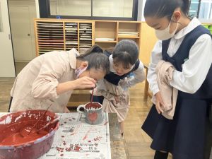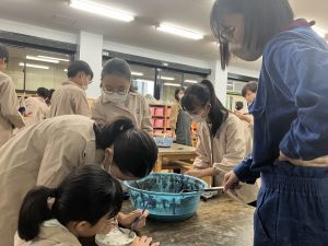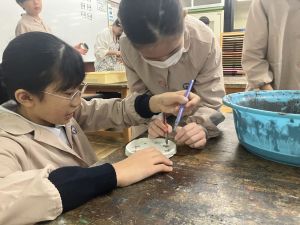 焼く前の釉薬の色を見て、焼き上がりの色を考えました。焼くと酸化するので、色が変わるそうです。