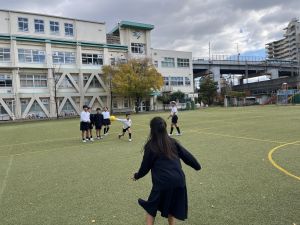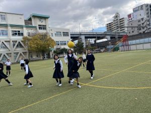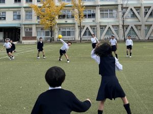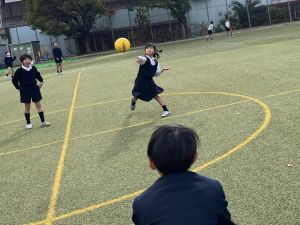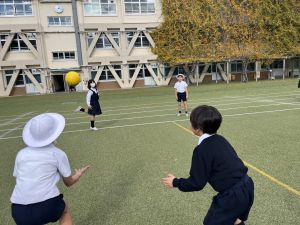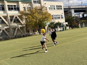 ドッジボールでは、「前で受ける」ではなく、「下がって受ける」か「下がって避ける」を覚えてきている子どもたち。