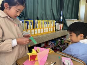 一昨日は廊下に吹き込んだ落ち葉に。昨日は手洗い場の乱れた牛乳パックに気づき、手を伸ばした子どもたち。