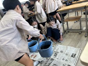 墨が教室の床や廊下に飛んでいたり、墨を入れるバケツがいっぱいになっていたりすることに気づいたお友だちが、