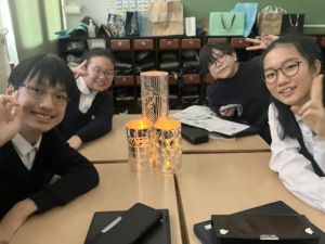 ・外国語の授業では、Christmas Partyと題しての「プチお楽しみ会」をしました!!「英語を使ったレクリエーション」というルールで、各クラスで考えたレクリエーションを楽しみました。Angela先生へのサプライズとして、図工で作った行灯も光らせました!!寝る時にもぴったりですね!!