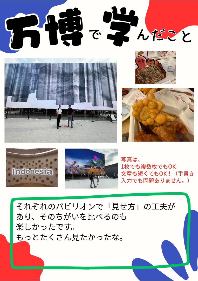 そこで、もし関西万博に来場され、その時のお写真を一部ご提供いただけるようでしたら、ロイロノートに送っている「指定用紙」に写真添付・一言記入にご協力お願いします。