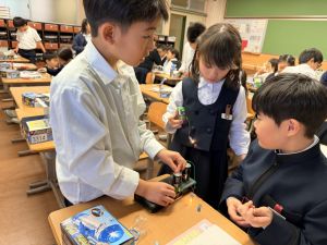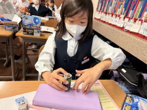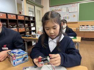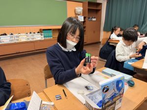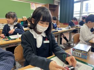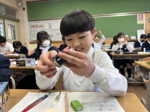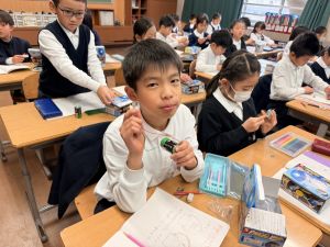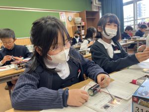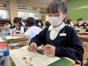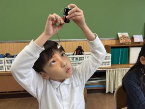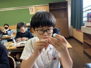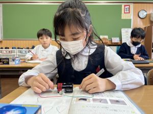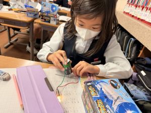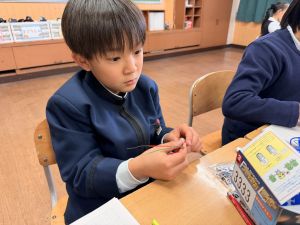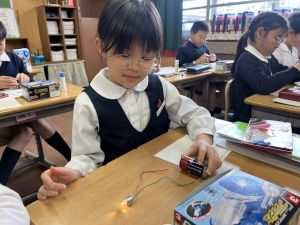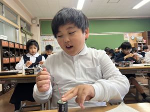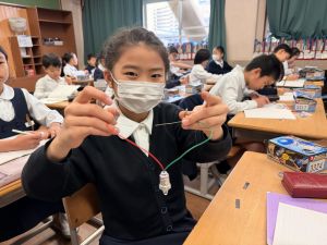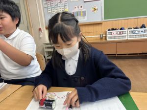 熱さだけに、電気の学習に入っています。豆電球・どう線・乾電池を使いながら、どうすれば明かりがつくのかを考え中。