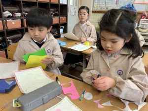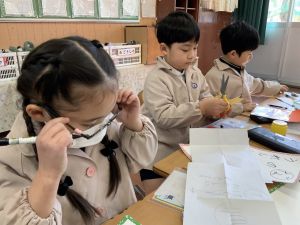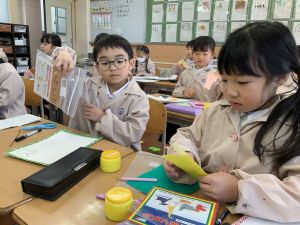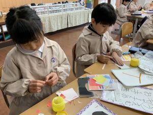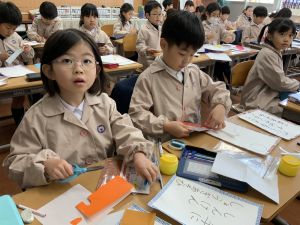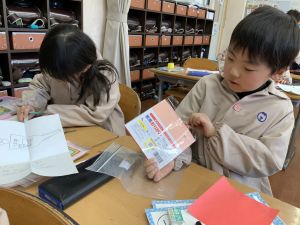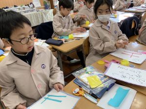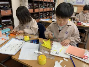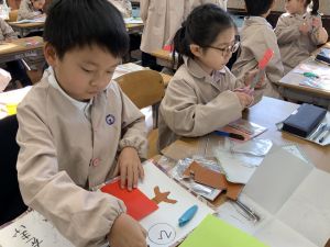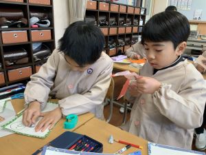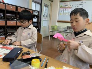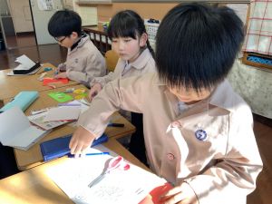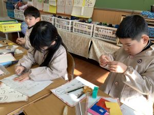 冬休みにたくさんチャレンジした「むかしあそび」のこつや楽しさを,カルタで表しています。「膝を使って…」「6がうまく出るように!」「風かぜふけふけ…」などなど,見つけたこつで読み札を作り,折り紙で絵札を作っています。