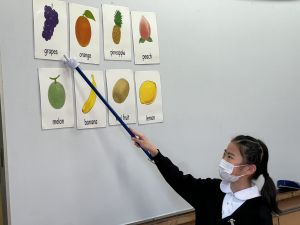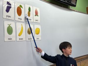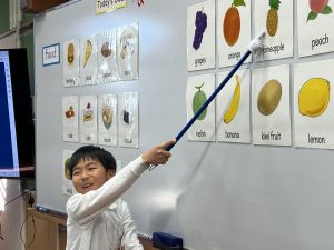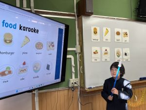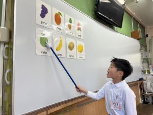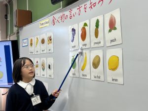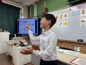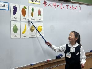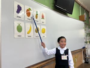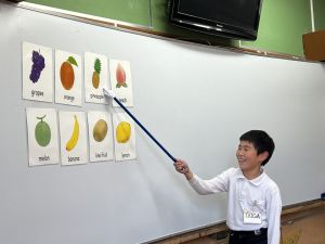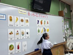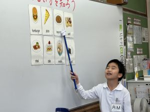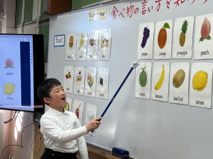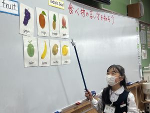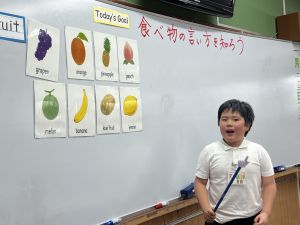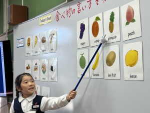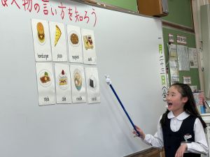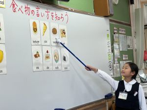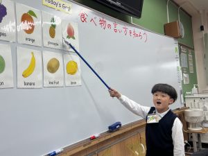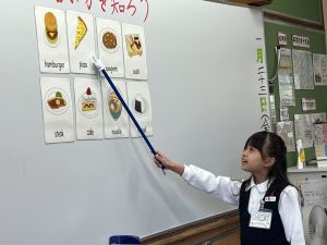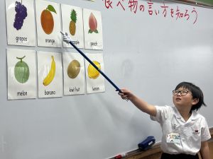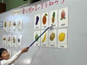 食べ物の英語での言い方をマスターしようとする子ども達の様子、ご覧ください。