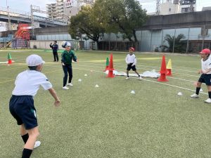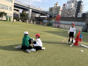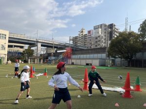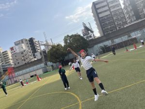 縦長のコートで、相手にボールを取られたり、コートから出たりしないように、ゴール目指してボールを運んでいきます。