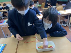 算数科の学習では、今日は色棒を使った「形づくり」の学習を行いました。