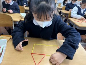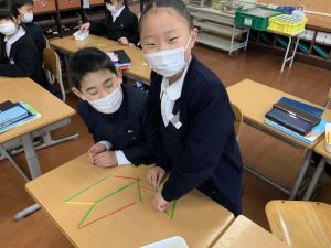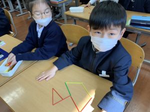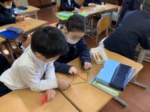 と、重なった辺を共有することで2つの三角ができるという“図形の不思議”に気づくことができました。