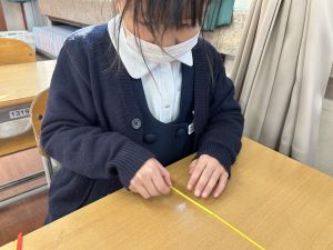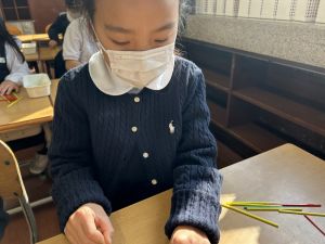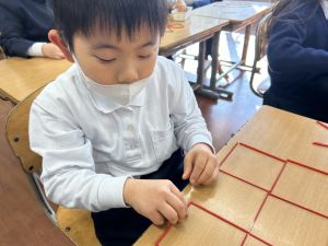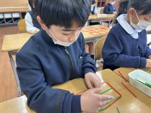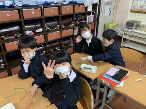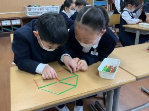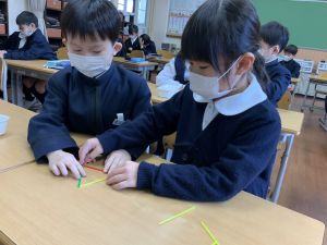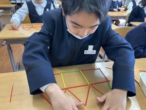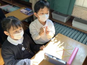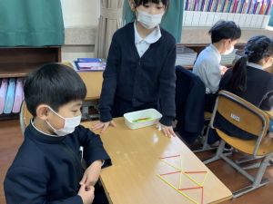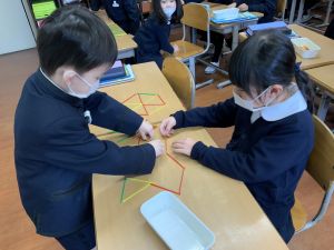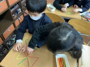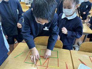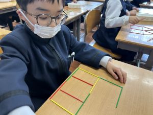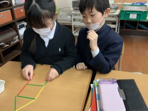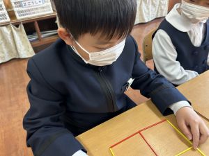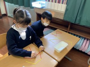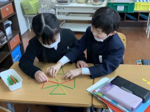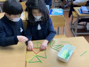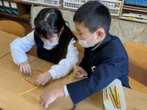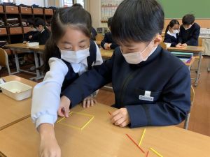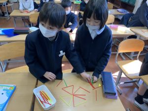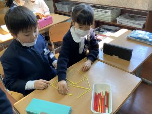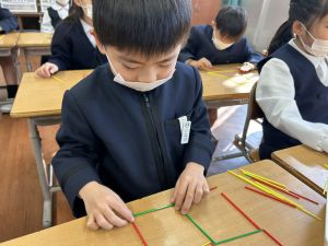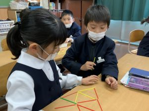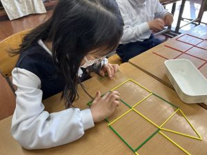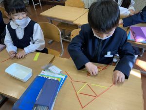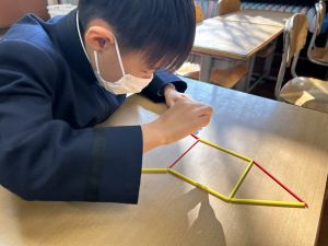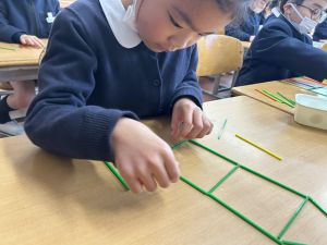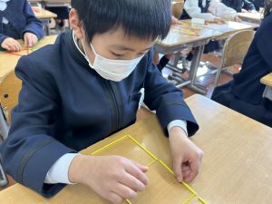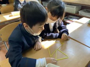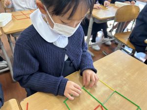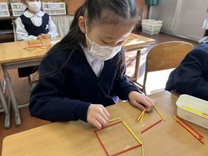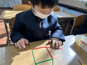 実際に三角や四角を作りながら、「三角は3本」「四角は4本必要なんだ!」という発見も次々と生まれました。