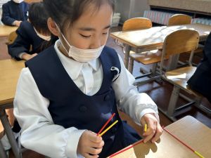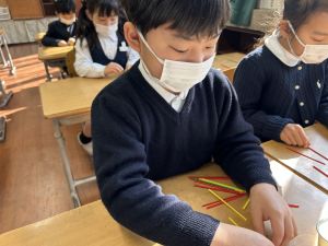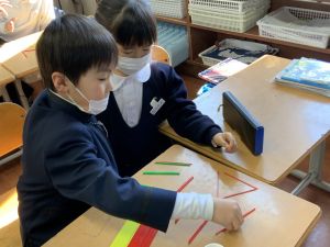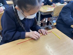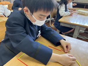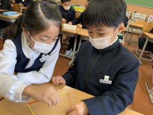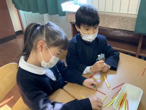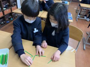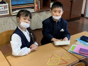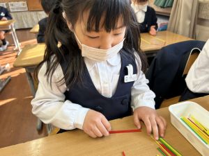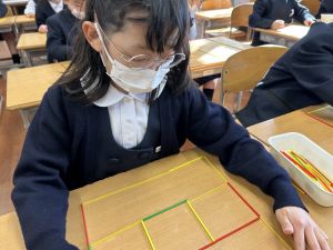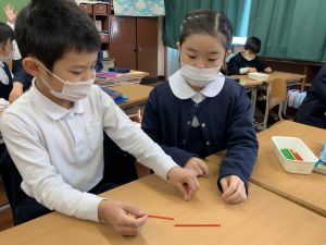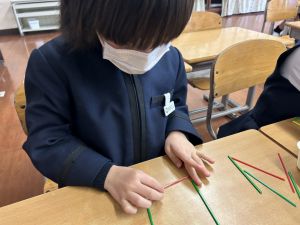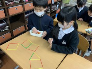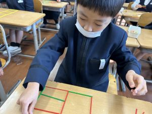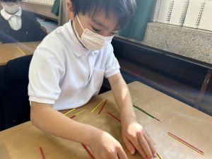 算数科の学習では、今日は色棒を使った「形づくり」の学習を行いました。