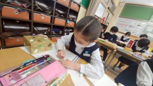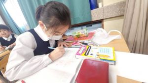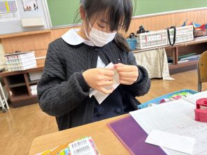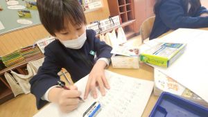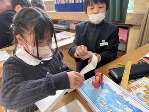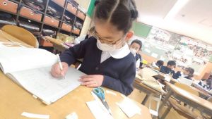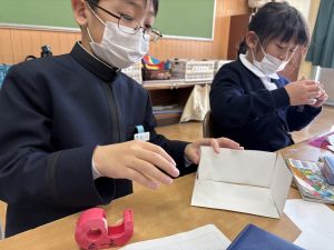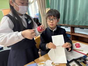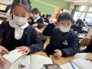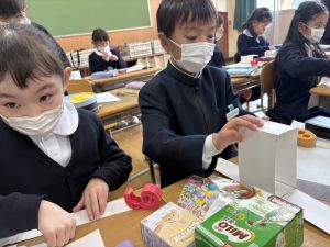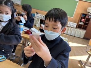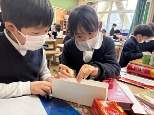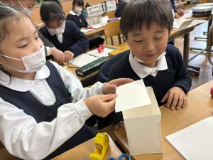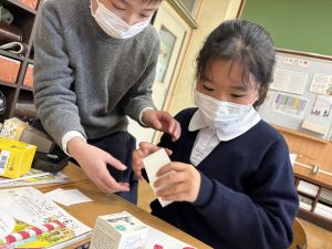 算数は、小林先生と「はこはかせ」を目指しています。作った箱を写しとって、自分で箱を組み立てたり、気づいたことを話し合ったり、はこのふしぎやひみつを見つけています。