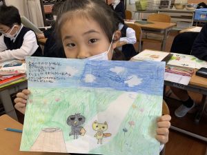 教科書に載っている一枚の絵(動物たちがにぎやかに描かれた絵)をもとに、子どもたちは想像をどんどん膨らませながら、自分だけの物語をつくってきました。