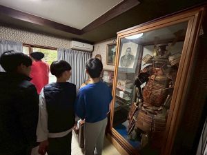 築300年の家を見物させてもらいました。金屏風の前でパシャリ!干し柿をおやつにいただきました。収穫した金柑に穴を開けて蜂蜜金柑漬けの準備です。作業が終わったら、ピザを作る予定です。