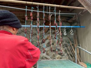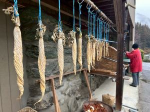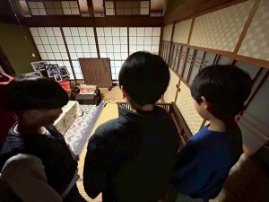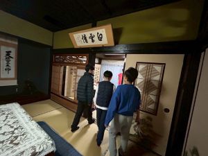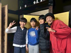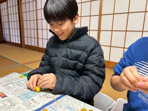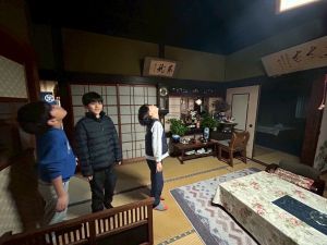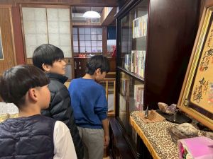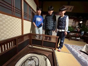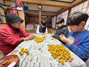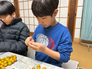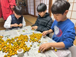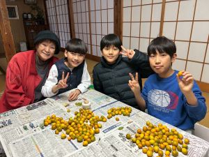 築300年の家を見物させてもらいました。金屏風の前でパシャリ!干し柿をおやつにいただきました。収穫した金柑に穴を開けて蜂蜜金柑漬けの準備です。作業が終わったら、ピザを作る予定です。