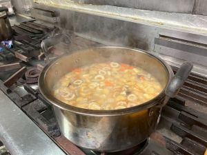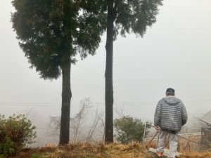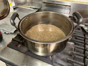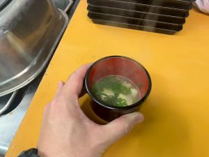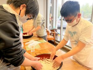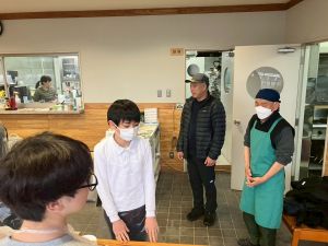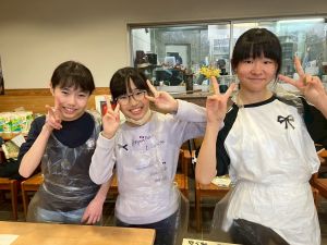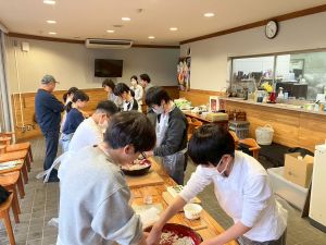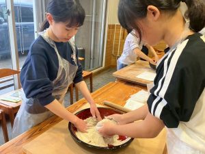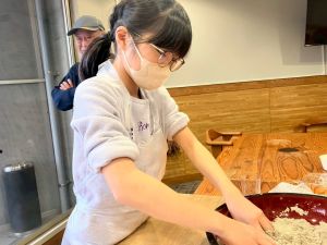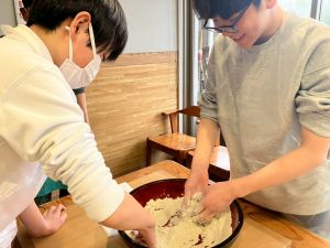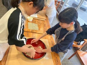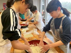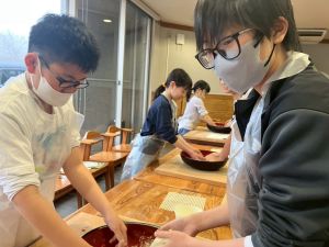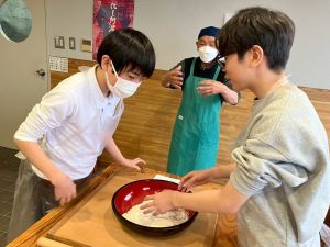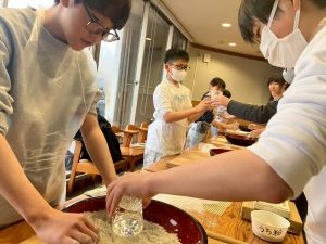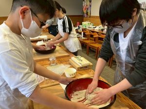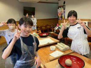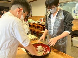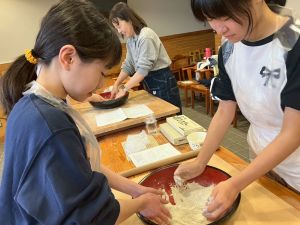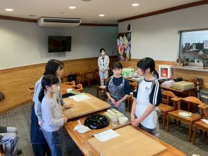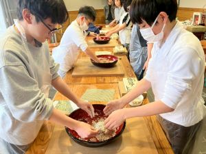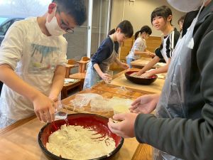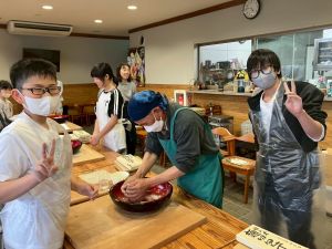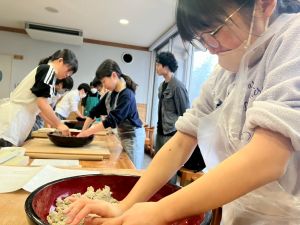 ここは中川さん宅に泊まる二つの班が合同で活動を行っていました。そば打ち体験をさせていただきました。その前には、夕食で食べる郷土料理「そば米雑炊」の準備をしていたようです。味見をさせていただきましたが、とても美味しかったです。