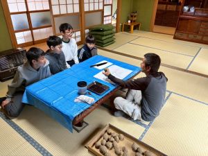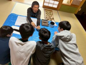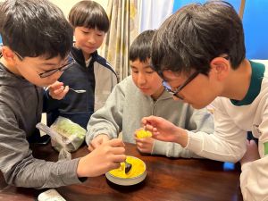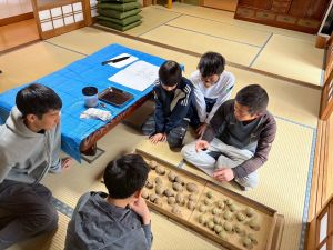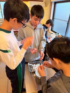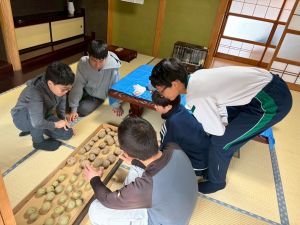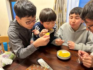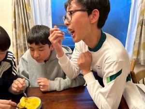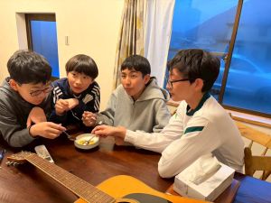 じゃがいもの種イモを切る作業をしました。そして、夕飯作りのお手伝いをしました。少し味見をしましたが、美味しくできていました。初めて会った!?と思うくらい、夕方には打ち解けていました。夜にはギターを演奏してくださるみたいです。