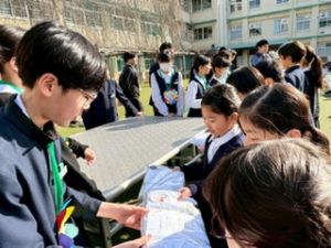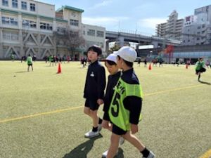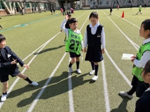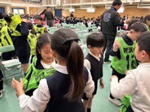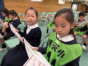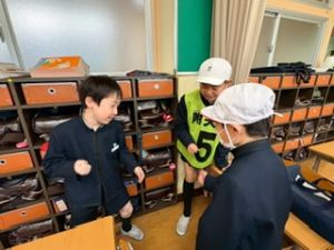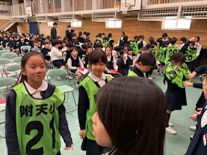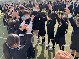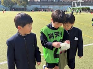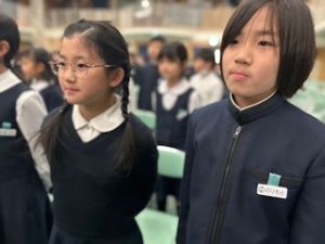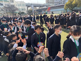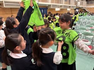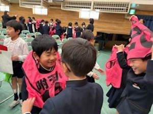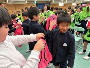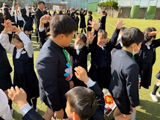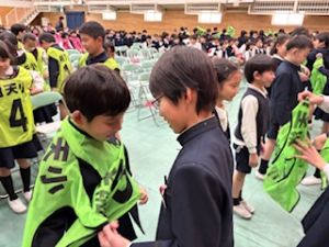 3年生が退場する前、3年生から「トリオゼッケン」が継承されました。リーダーからゼッケンを着せてもらうとき、嬉しそうな表情、照れている顔、3年生とお別れに少し寂しそうな様子、いろんな思いがそこにはありました。