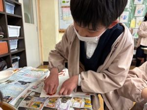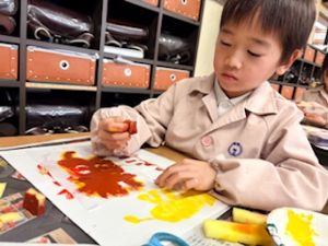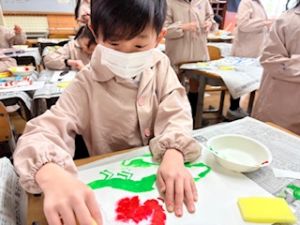 本日のメインの活動は、生き物の形に切ったシールを画用紙にはって、絵の具を使って、トントンです。自分の作品にあう絵の具の色を決めたら、いざトントン!