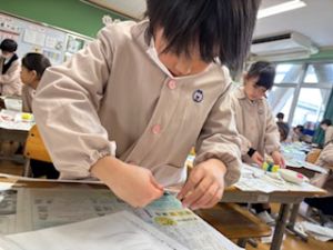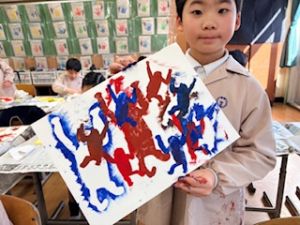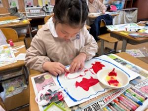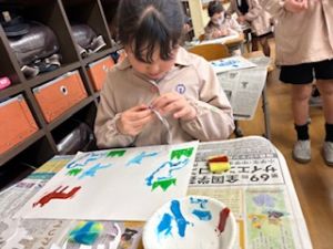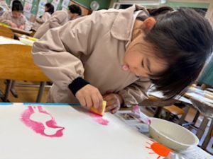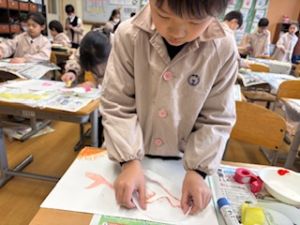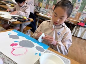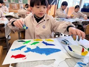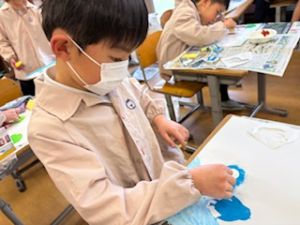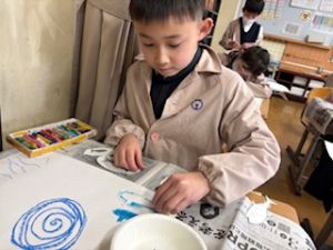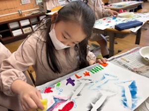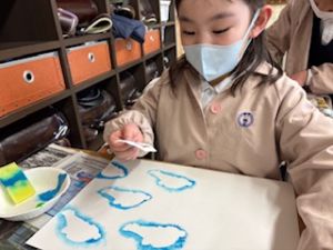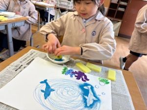 最後は、クレパスで仕上げをしています。それぞれの思い描いた群れの生き物が表現ができたかな?出来上がりが楽しみです♪