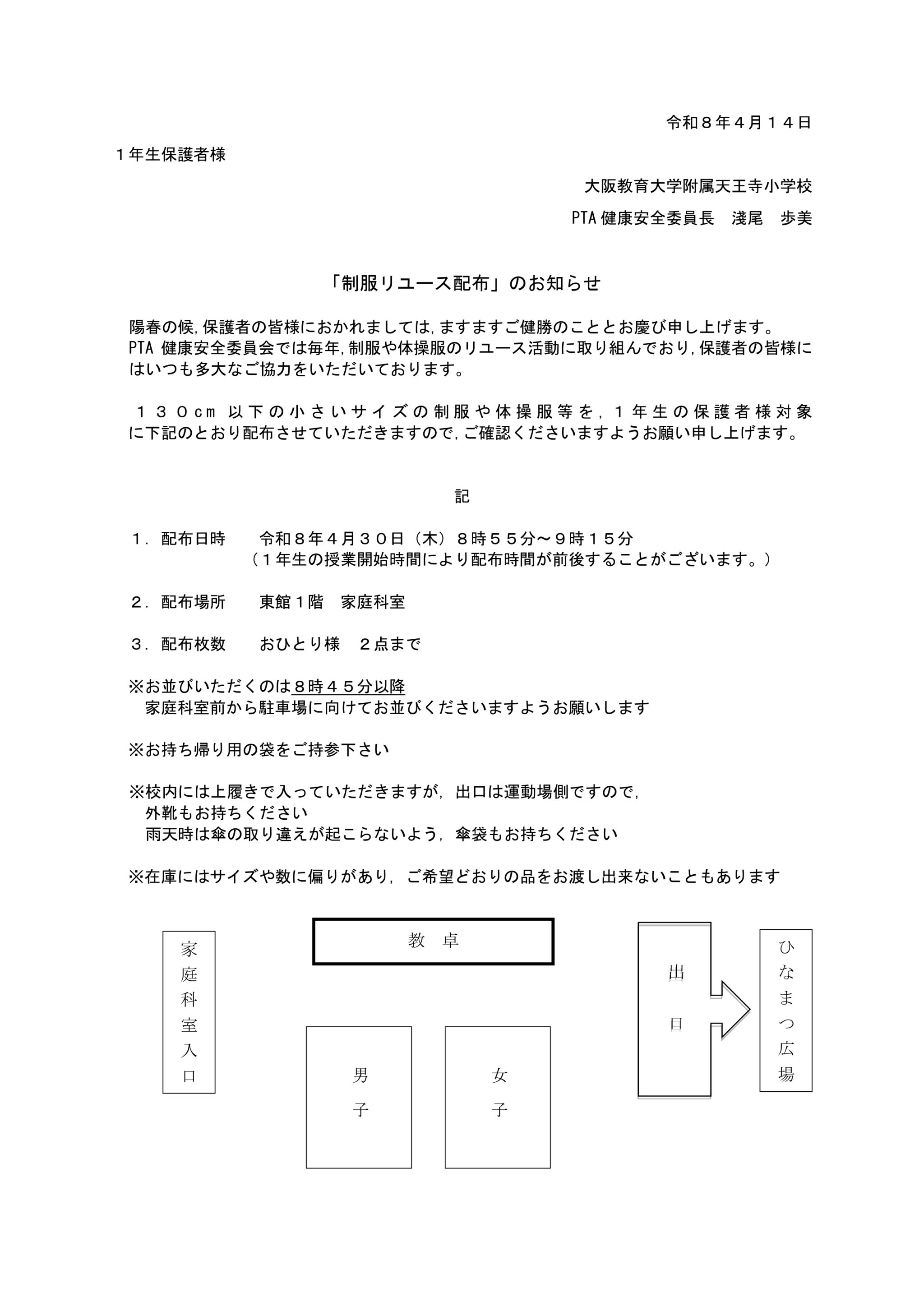 「制服リユース配布」 2026.04.14 1年生 « 前へ 一覧へ 次へ » 関連する記事 04.17 7日間のドラマ 英気を養う週末に。 2026.04.17 1年生 今年度の健康診断(一斉健診 HealthDay)について 2026.04.16 1年生 04.16 トリオ6周年 歌もトリオも「楽しもう」 2026.04.16 1年生 04.15 STEAM DAY 今日のデビューは? 2026.04.15 1年生 保護者専用 行事関係 落とし物 各種募集 お知らせ 6年生 5年生 4年生 3年生 2年生 1年生