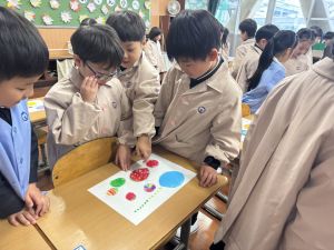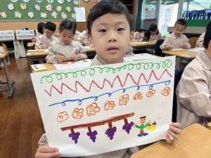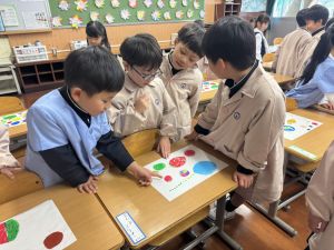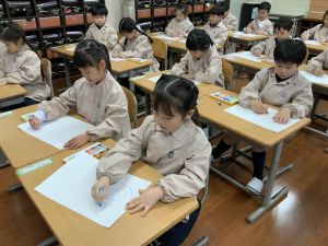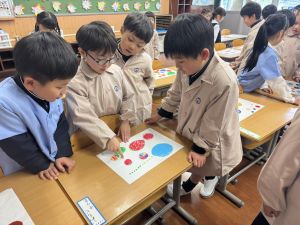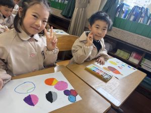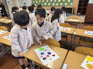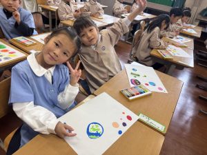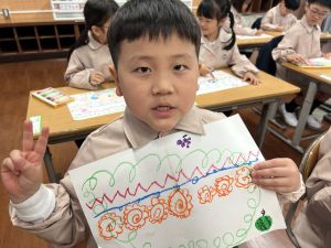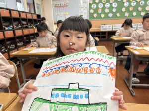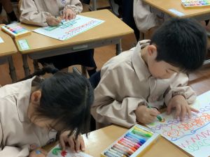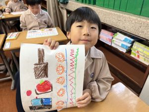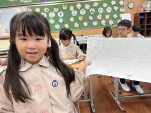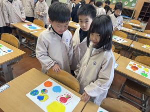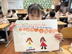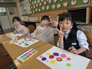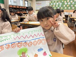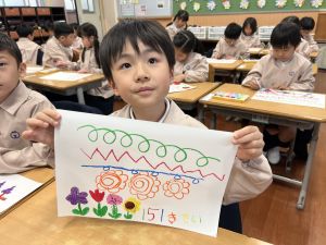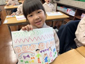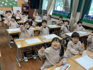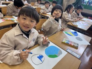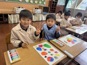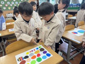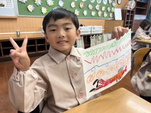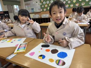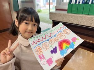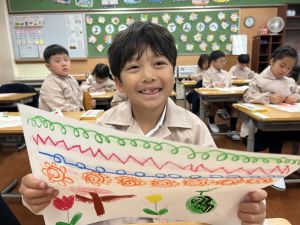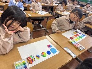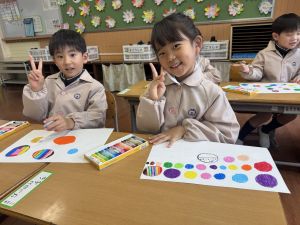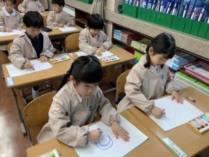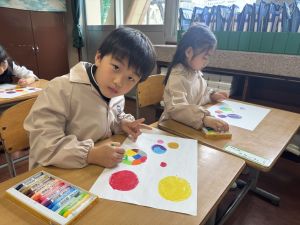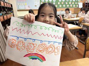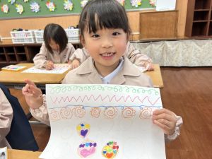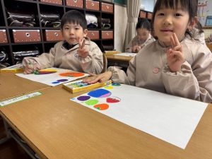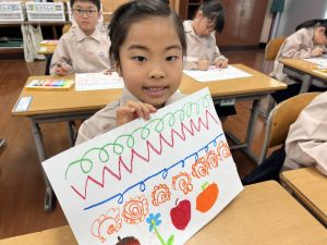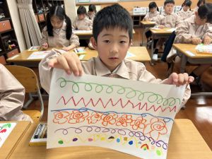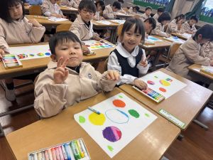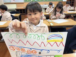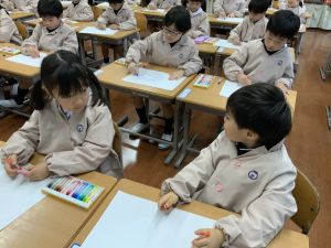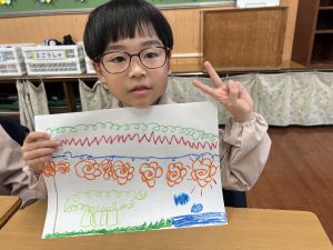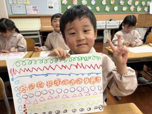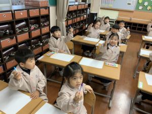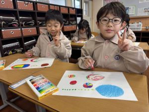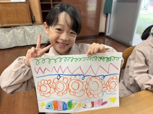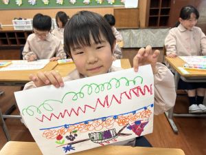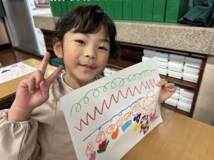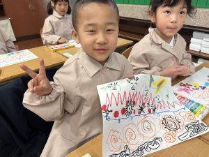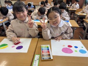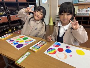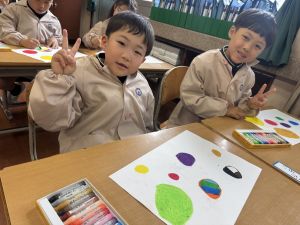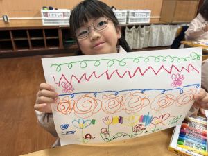 スモックの着替えにチャレンジした後は、クレパスに挑戦。