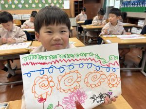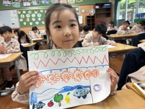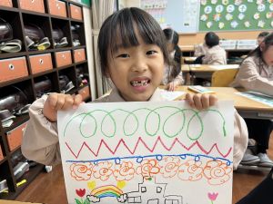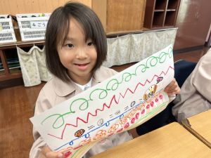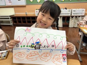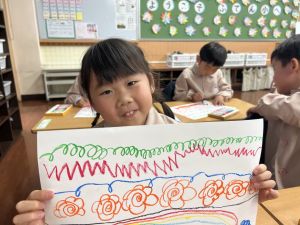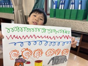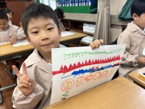 線を描いたり、丸を描いたり、塗りつぶしてみたり、描いた線からイメージを膨らませたり、紙いっぱいに自由に絵を描いたり、おもいおもいにチャレンジしました。