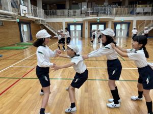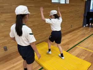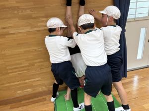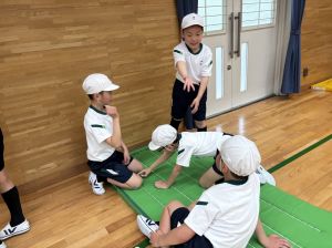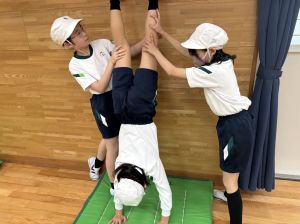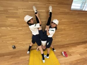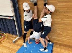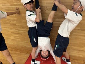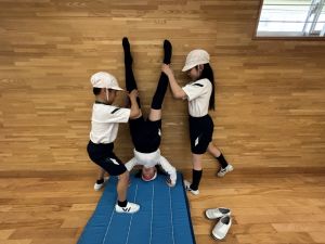 四年生初めての体育!体育館で、壁倒立や側転の練習をしました。