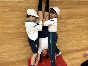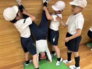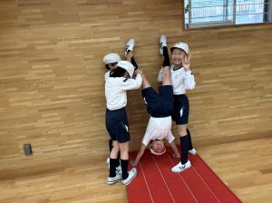 本日初めてだったので、きれいな壁倒立の完成までいった人は、ほとんどいませんでした。可能であれば、おうちを壊さない範囲で、保護者の方の立ち会いのもと、練習できたらと思っています。
