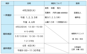 いつも本校の教育活動にご理解、ご協力をいただきありがとうございます。昨年度に引き続き、附属池田小中高、附属天王寺小中高において、一斉健康診断を実施いたします。日程と検査項目は以下の表をご確認ください。