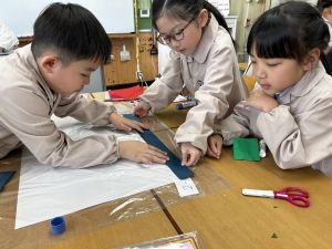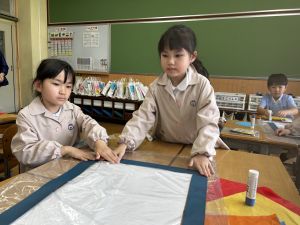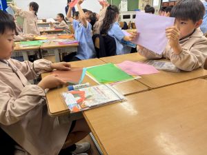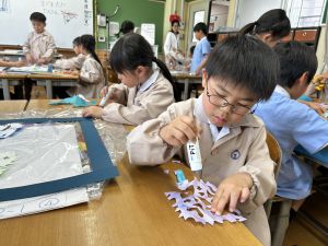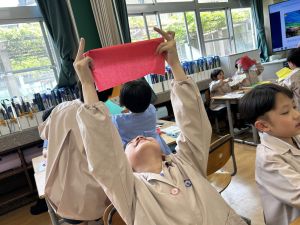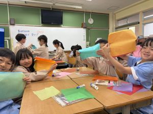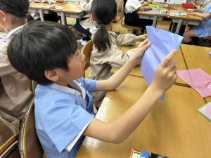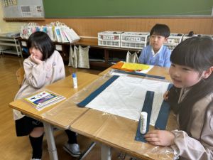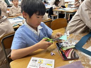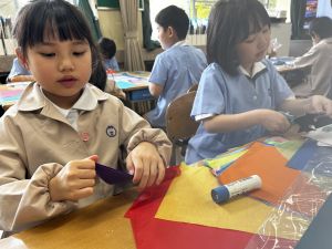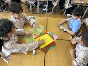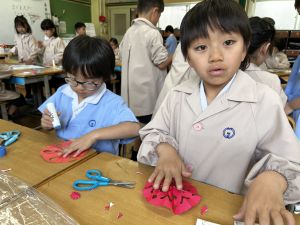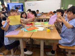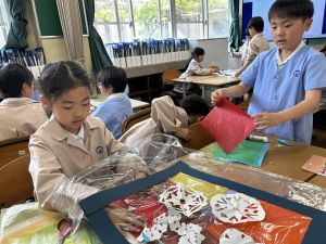 その後で、折り紙を折って切って、それを花紙に重ね、花紙の素材の特徴を生かしながら、作品を作っていきました。