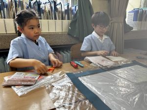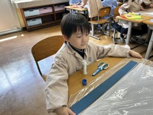 まず、ビニール袋に紺の色画用紙を張り、フレームを作りました。