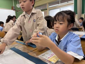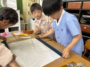 子どもたちが、材料にふれながら