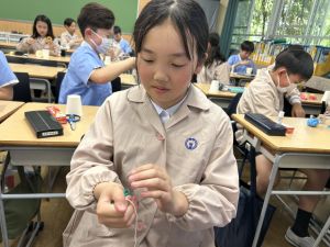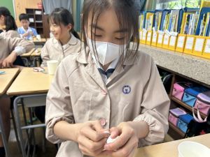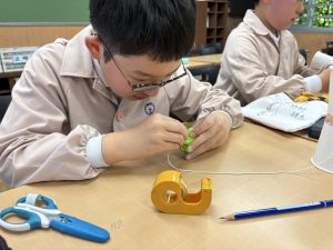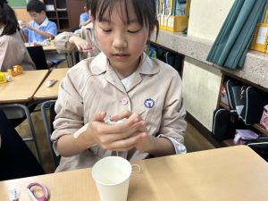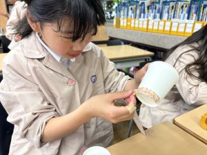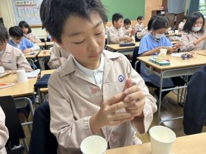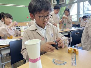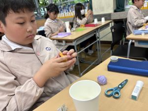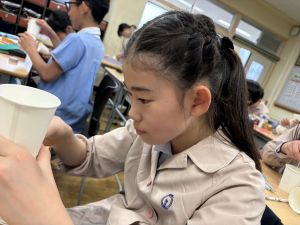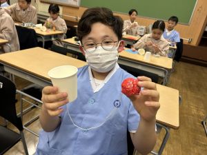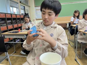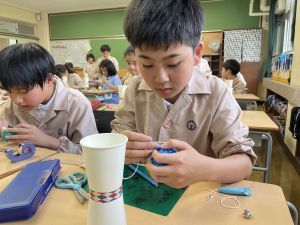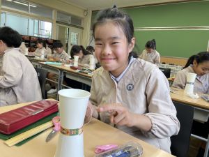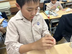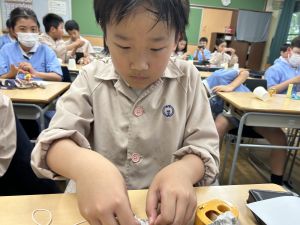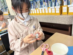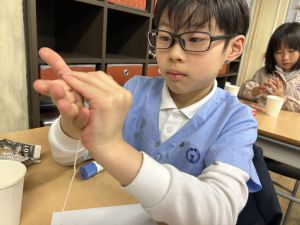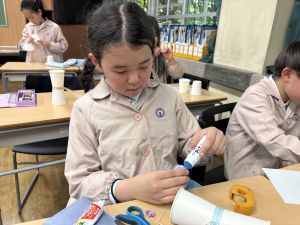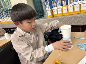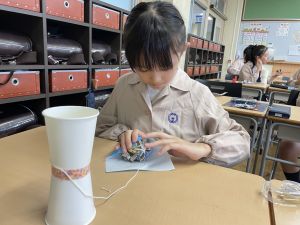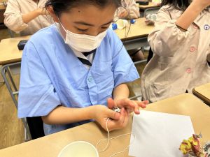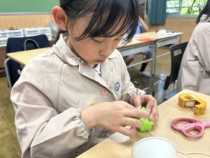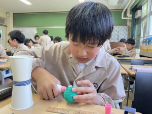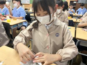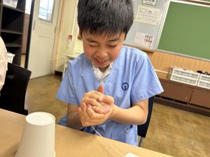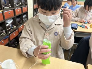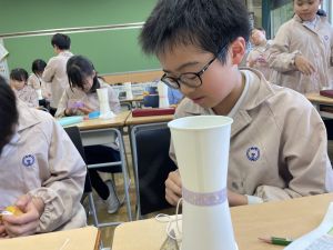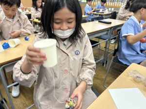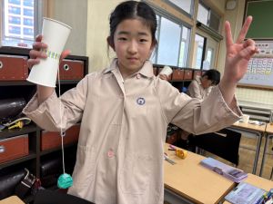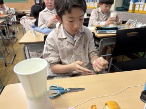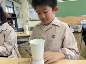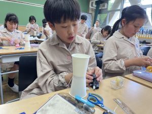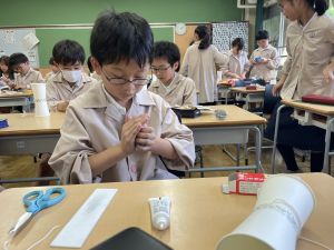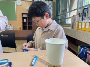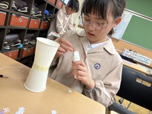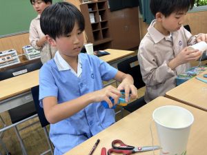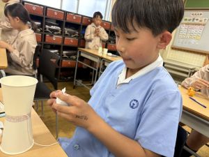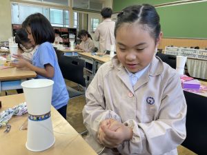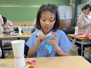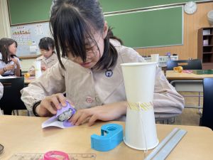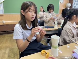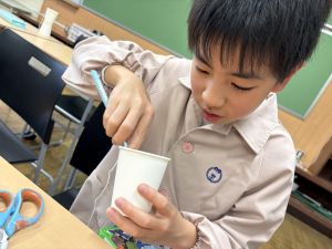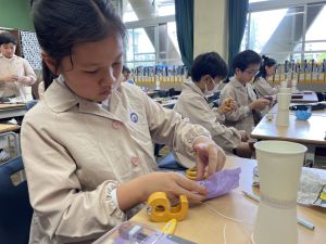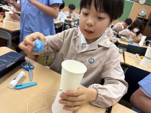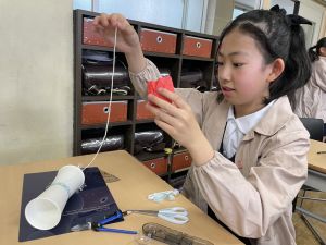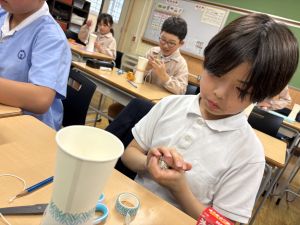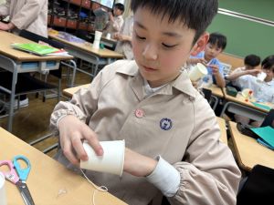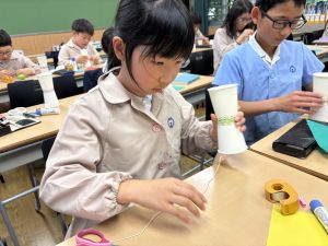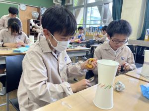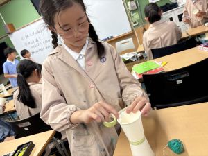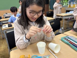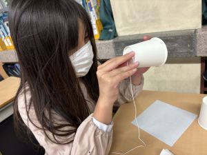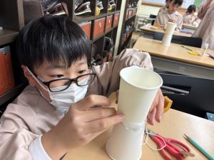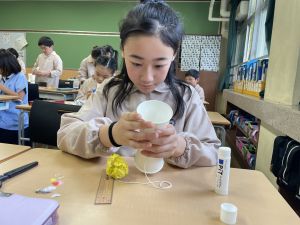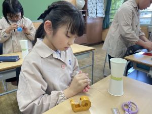 使用する材料は、紙コップ、タコ糸、マスキングテープ、折り紙です。その他、生徒自身が持っているセロハンテープや色鉛筆のみを使用します。