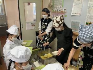 今日の給食を食べるにあたり、給食調理員の方・栄養教諭の松田先生が、随分前から準備をしてくれていました。