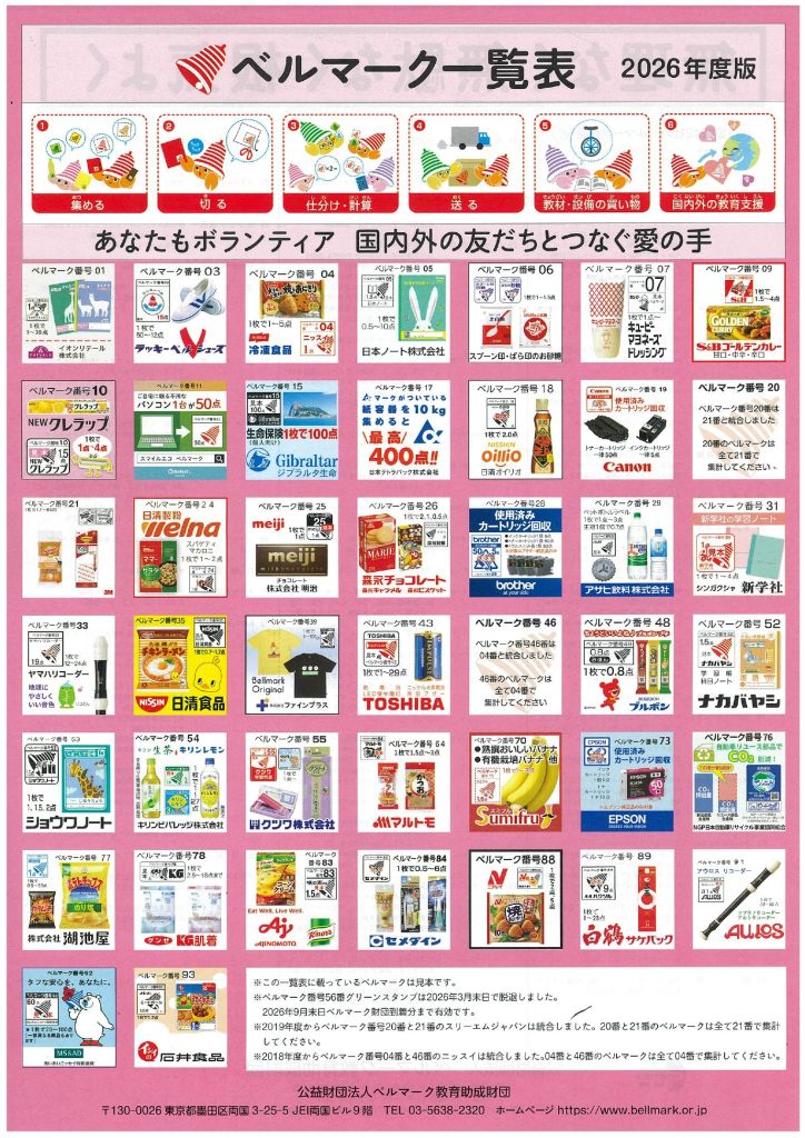明日、下記一覧表を配布します。どのような製品に「ベルマーク」がついているか、参考までにご覧いただければと思います。