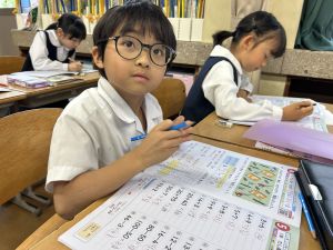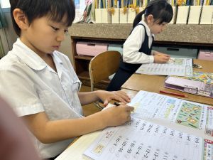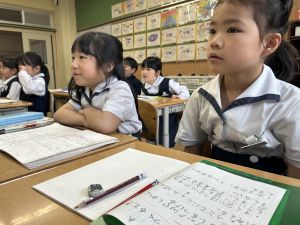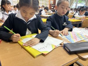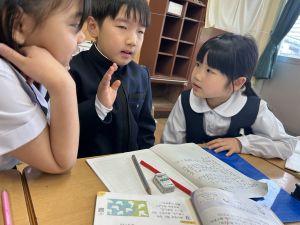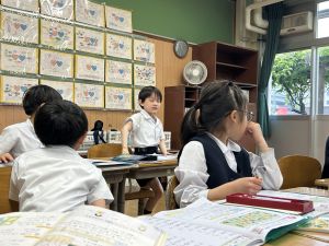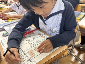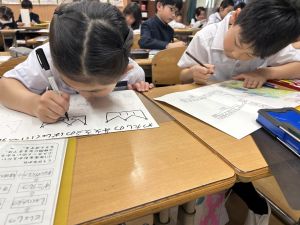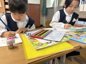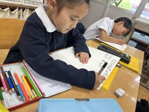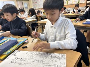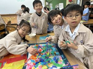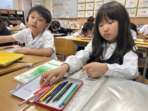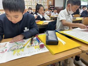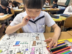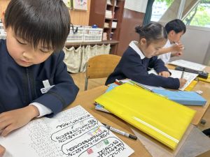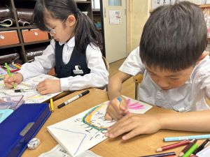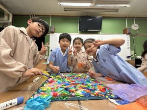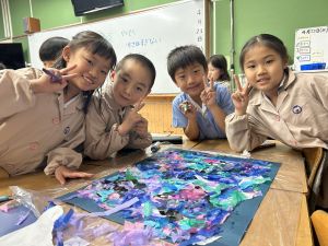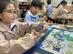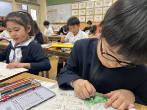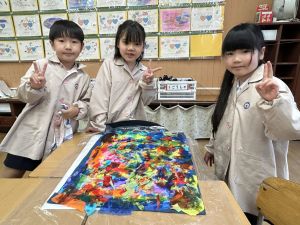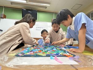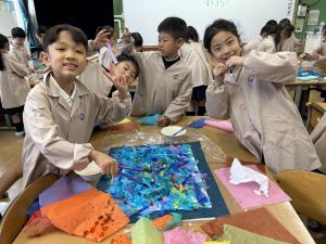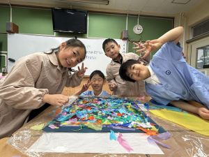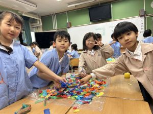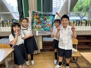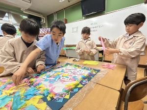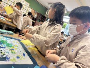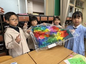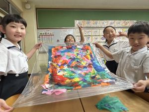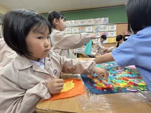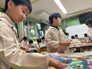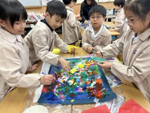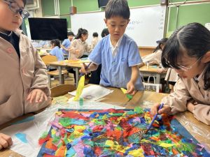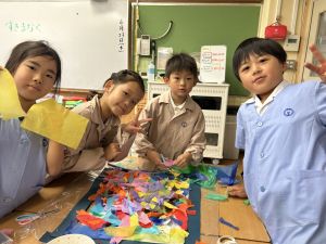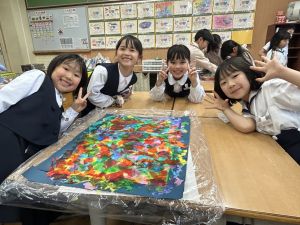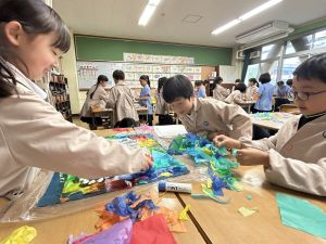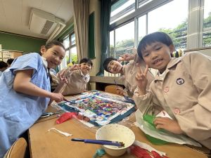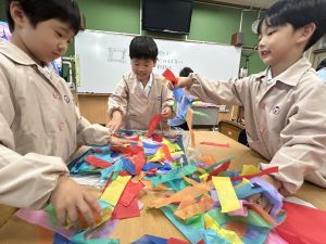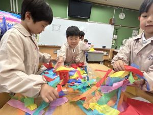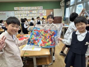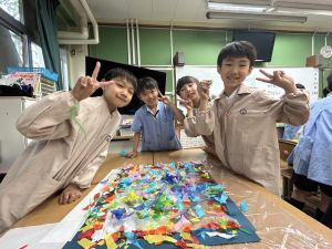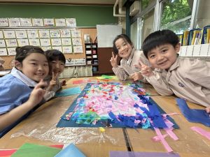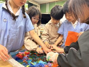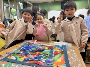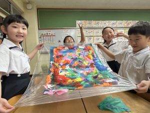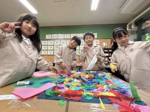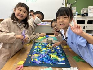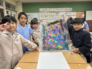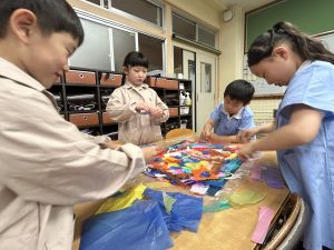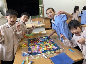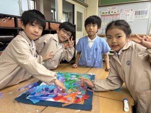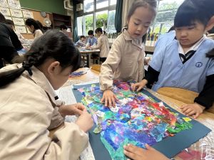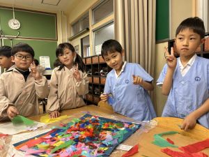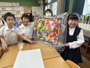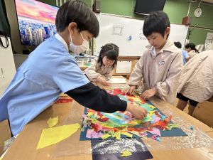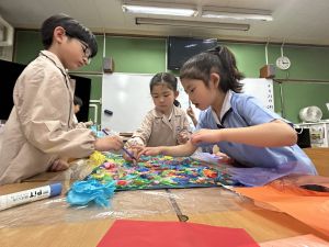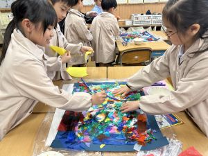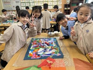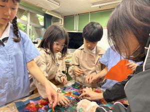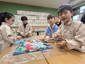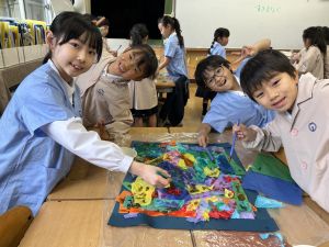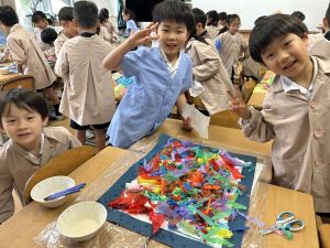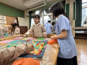 今日の図工は、花紙を使ったステンドグラス作りで、グループのみんなでひとつの作品をしあげます!!