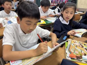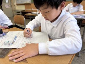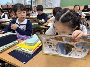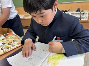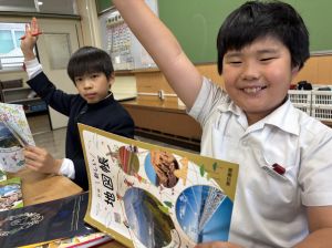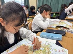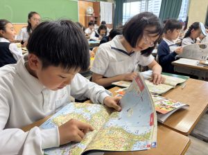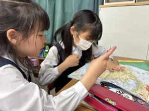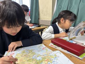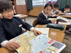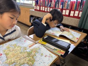 社会の学習では、子どもたちが作ったクイズをもとに、地図帳から答えを一生懸命見つけようとする姿が見られました。