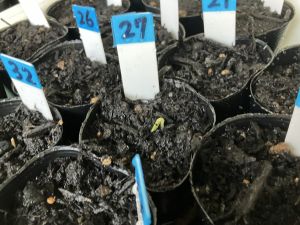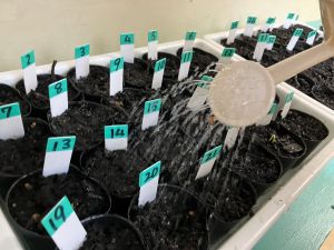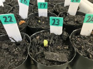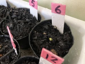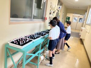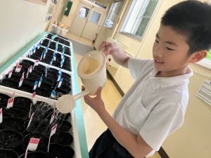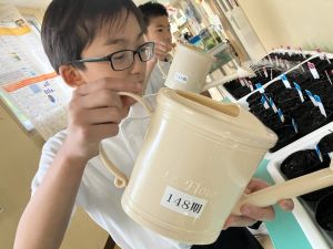 先日の理科の学習でタネを植えたポットに、毎日交代で飼育・栽培委員さんたちが水やりをしています。そして、昨日から少しずつ芽が出てきているようです。委員さんはいつ芽が出たかの記録もしています。