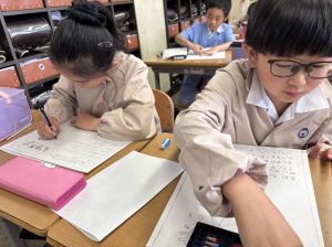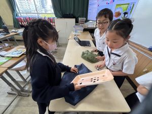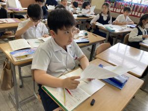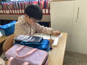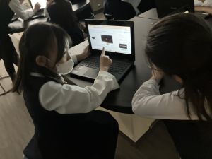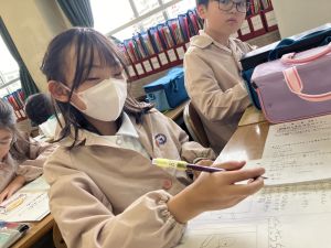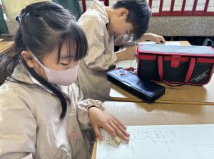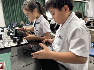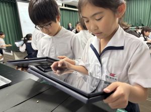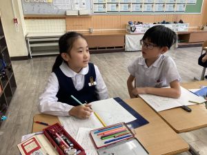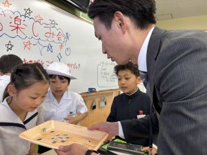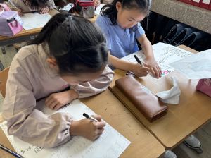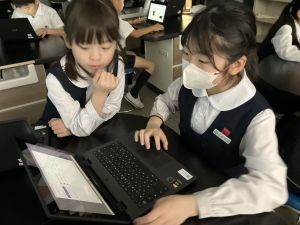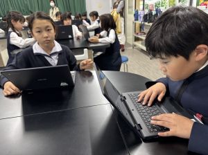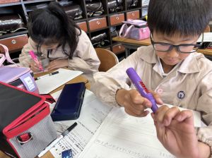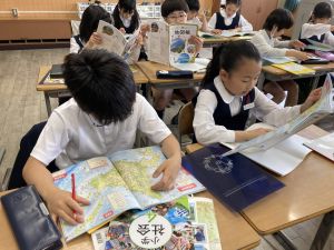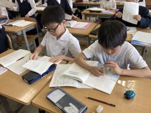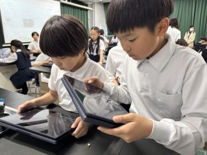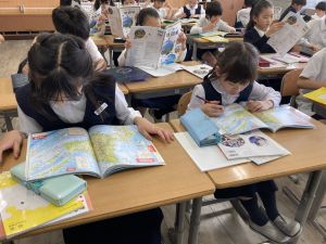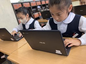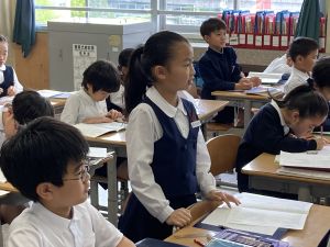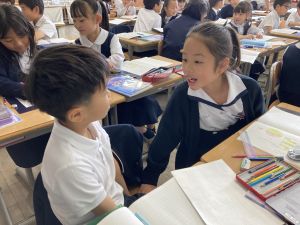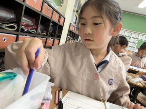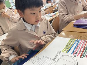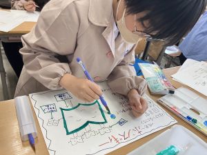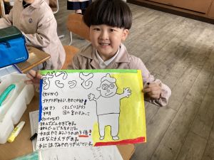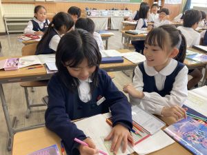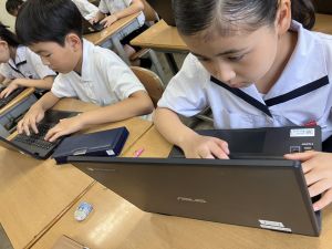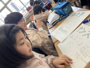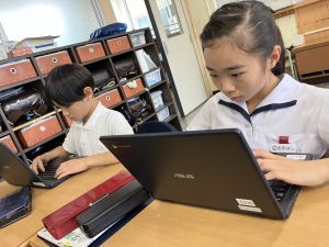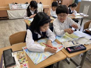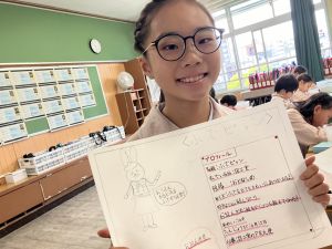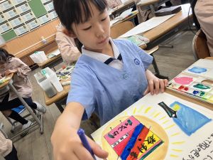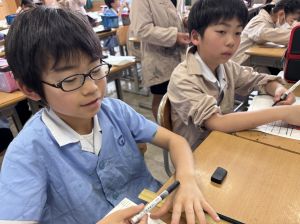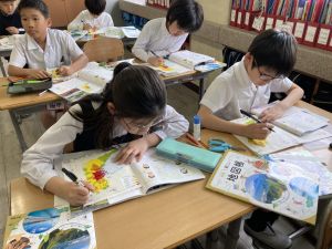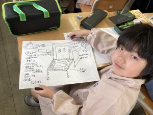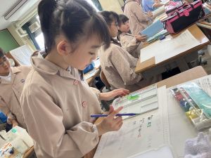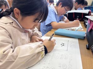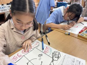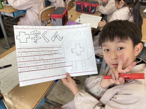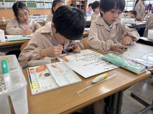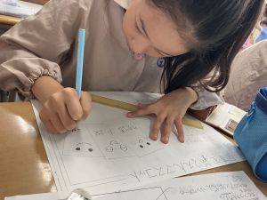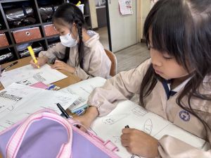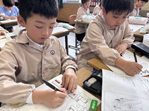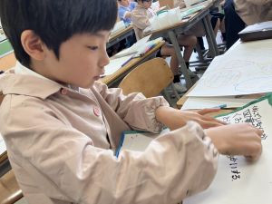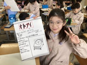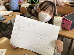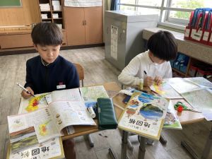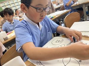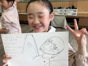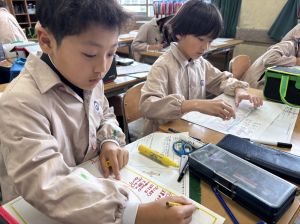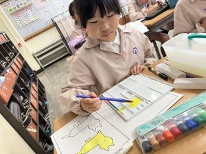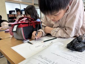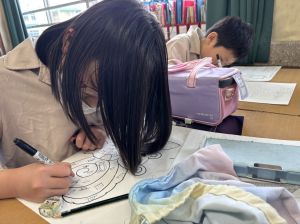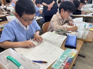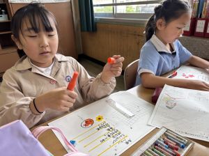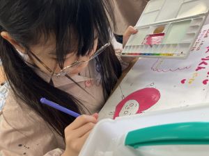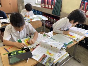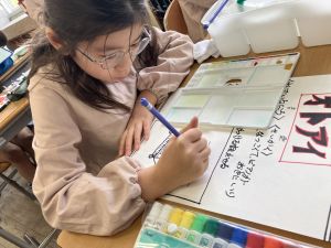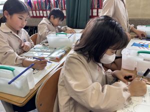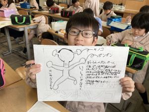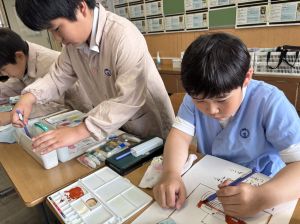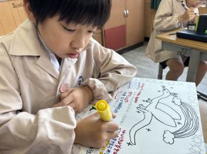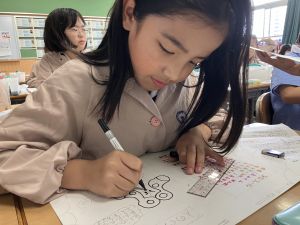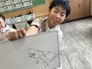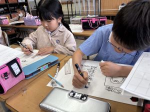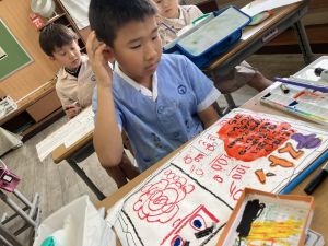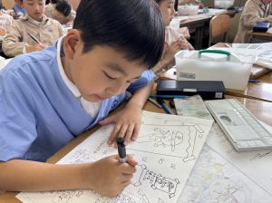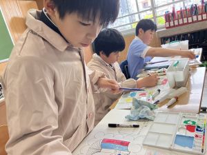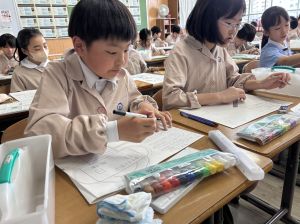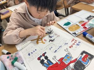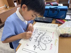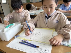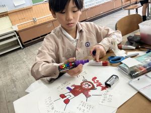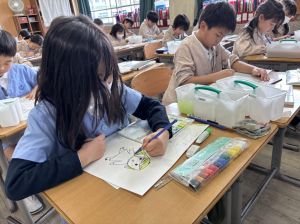 図工の学習では、自分の作ったキャラクターに色付けをしていきました。