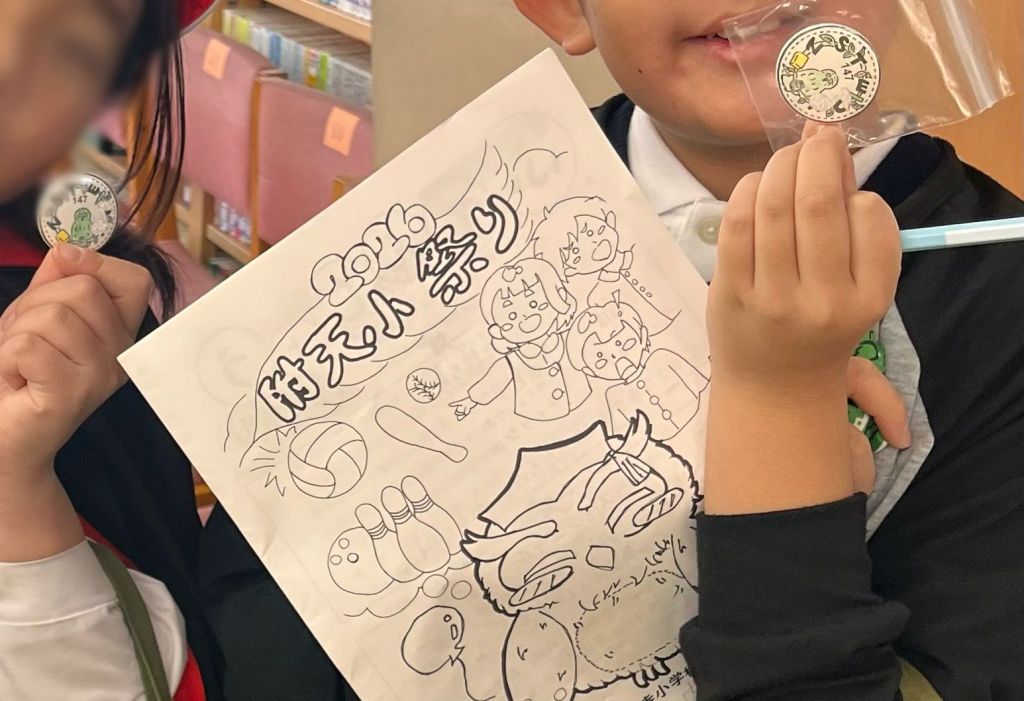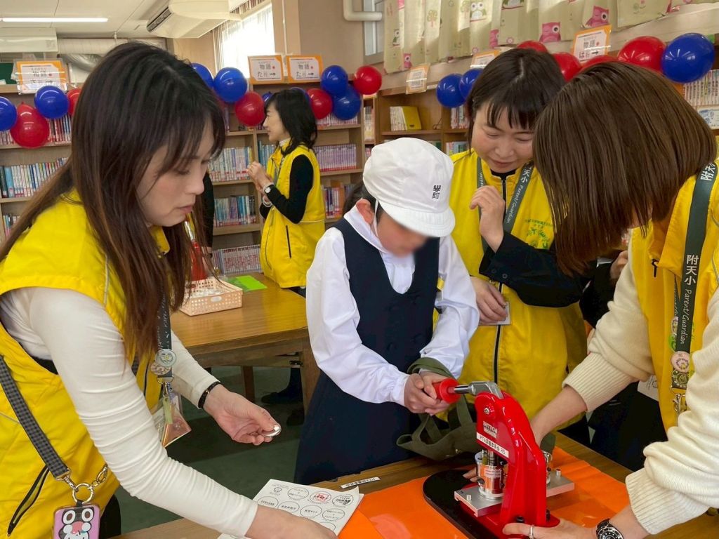 2月14日(土)、突き抜けるような青空。附天小の校舎が活気に包まれる中、PTA図書委員会による✨オリジナル缶バッジ工房✨が華やかにオープンしました!