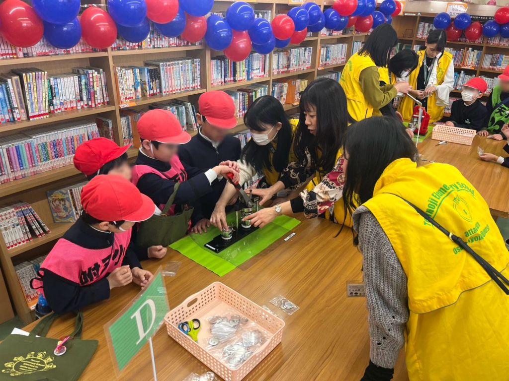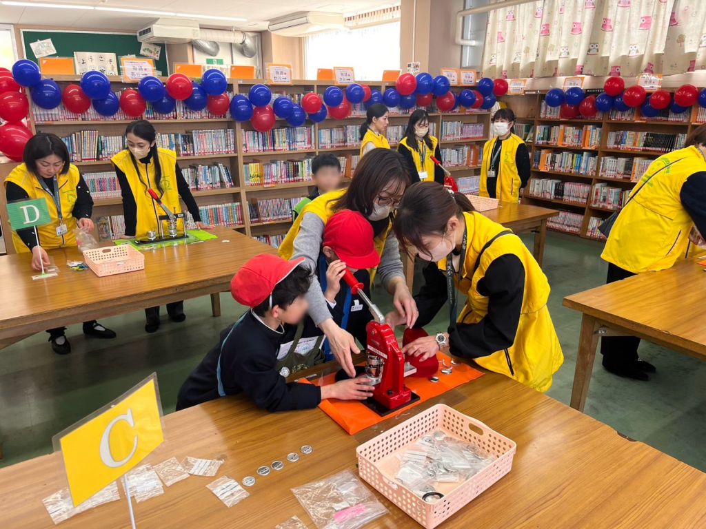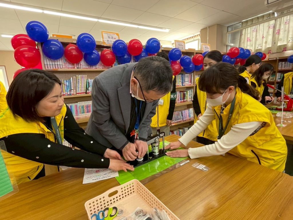 この日の図書室は、ただの「本を借りる場所」ではありません。一歩足を踏み入れれば、そこは別世界。子どもたちの夢を形にする、熱気あふれるオリジナル缶バッジ工房へと進化を遂げました。